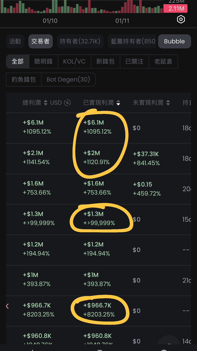 到每個熱門代幣 ➡️ 交易者,點「已實現獲利」排序下來