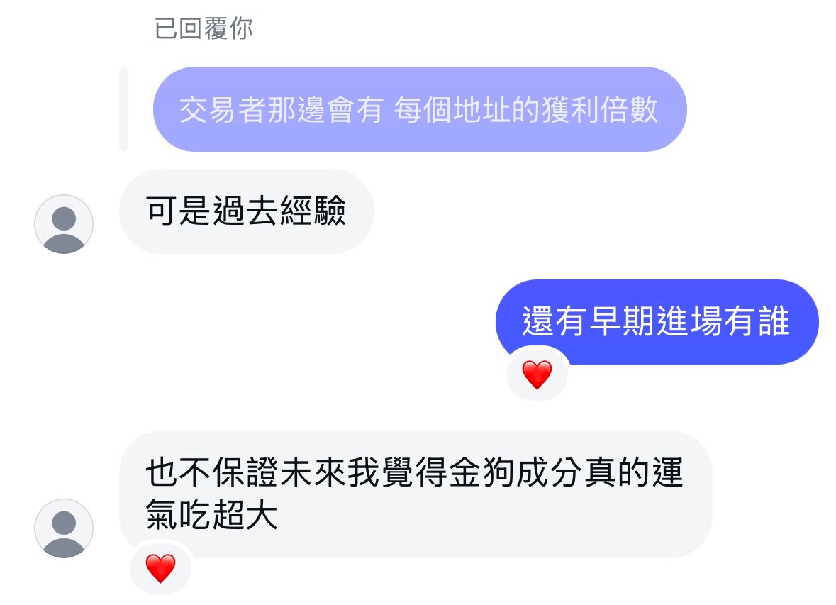 換個角度想:若你挑的地址都是風控很好,跟了不至於讓本金磨光的選手,只要跟單有辦法一直運行下去,是不是某天自然就會吃到金狗了🤣