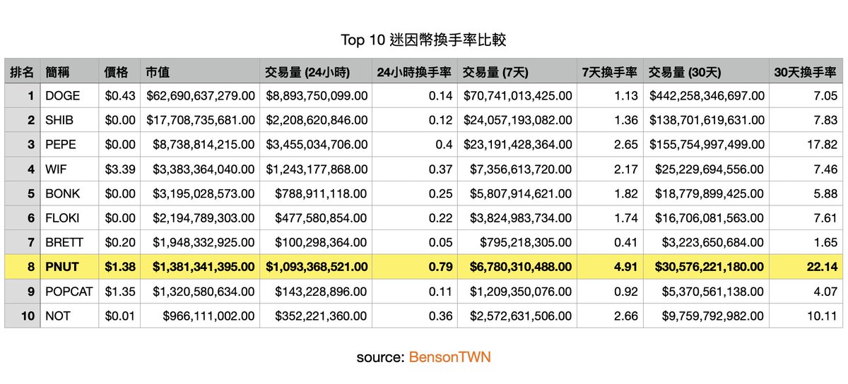 $PNUT 市值排第九,但單日換手率、7 日換手率、30 日換手率三項數字全部都排名第一。