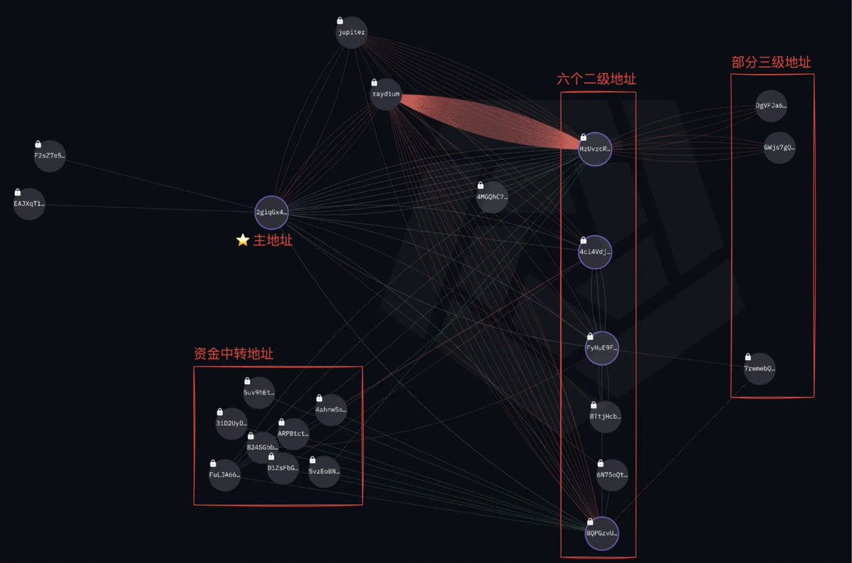 二級地址將少量代幣派發至三級地址拋售,且二級地址間頻繁有代幣進出
