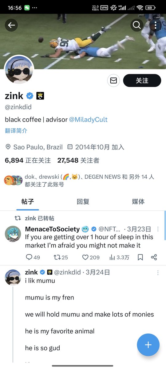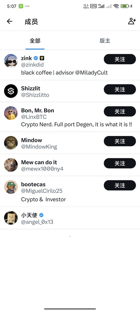 點開推特,發現項目方鏈接的是一個推特社區。然後看成員,版主有 2 萬多粉絲,且簡介上寫著米萊狄(Milady)的顧問,然後他又不屬於經常發推的那種,所以可能是一個比較牛逼的人發的幣。