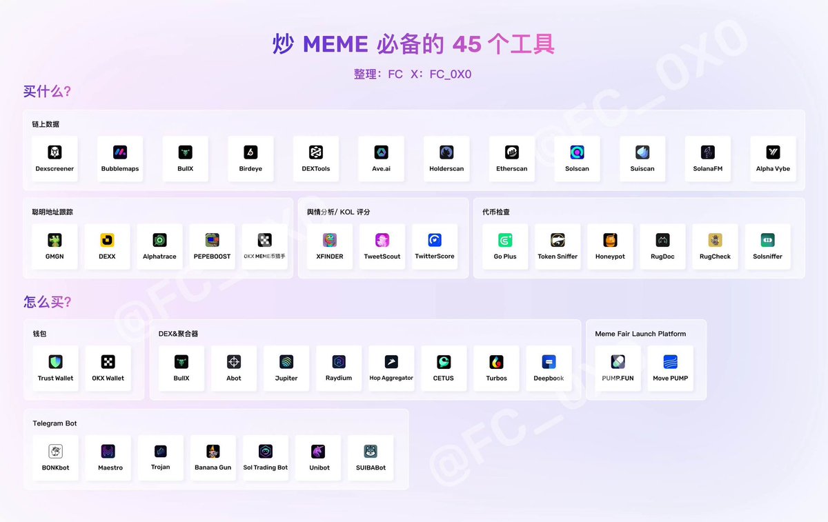 本文整理了炒 Meme 幣必備的 45 個工具,涵蓋基礎設施、鏈上數據分析、發幣平台、安全檢測和 Telegram 機器人等多個類別。