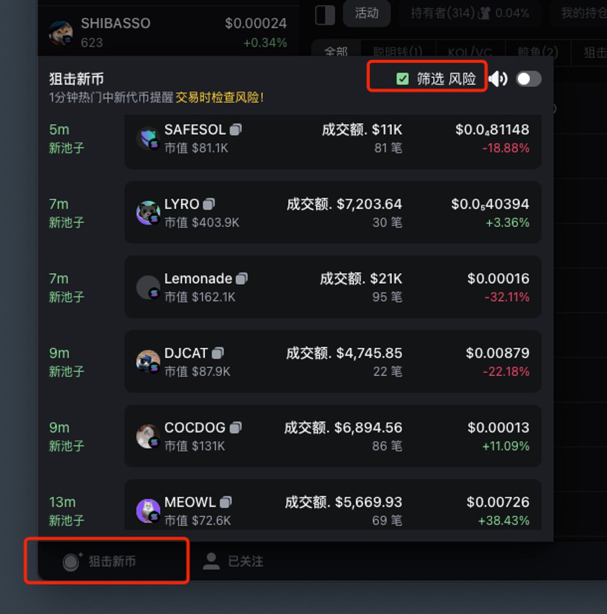 盯著網頁(https://gmgn.ai)左下角的「新幣狙擊」區塊,發現新幣時點進去查看檢查燃燒機制 🔥