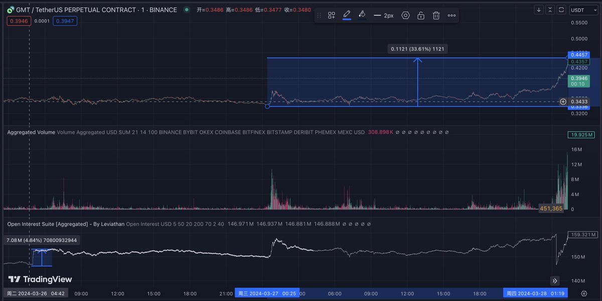 在 26 號的時候透過 TradingView 的監控看到合約持倉量有一波爆拉,但是幣價沒有什麼波動,這時候就將 GMT 定為重點觀察的幣種之一。