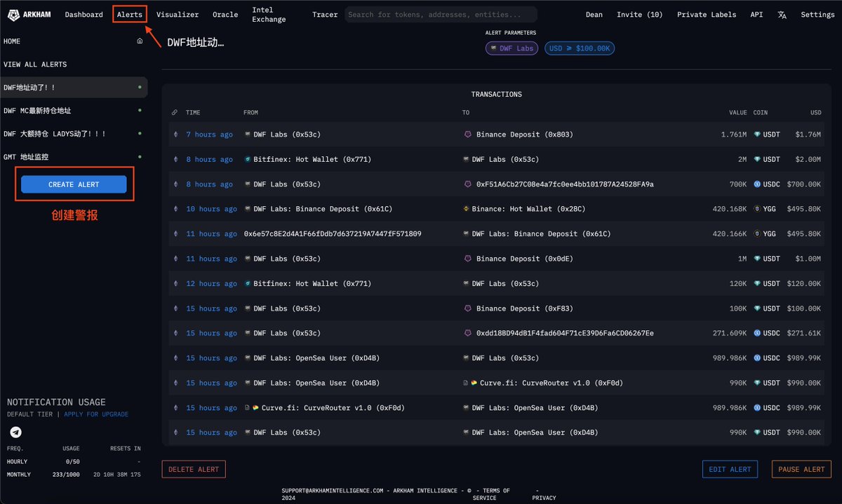 地址的監控警報可以使用 Arkham 的 Alert 功能,將目標監控的地址直接輸入,地址只要有 transaction 就會直接轉發到你的 Telegram 或郵箱,都是免費的很好用。